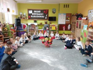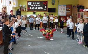 Dzieci z grupy IV „Leśne Duszki” przedstawiły krótki montaż słowno – taneczny z okazji Dnia Edukacji Narodowej. Swoją obecnością zaszczycili nas Sz.P. Krzysztof Szpyt – Burmistrz Miasta Lubaczowa, Sz. P. Danuta Żmurko – poprzednia pani dyrektor placówki oraz obecni nauczyciele i pracownicy przedszkola.