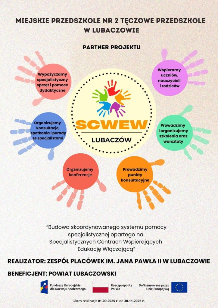 Projekt SCEW ma na celu budowanie skoordynowanego systemu pomocy specjalistycznej opartego na Specjalistycznych Centrach Wspierających Edukację Włączającą. Udział w projekcie poprawi dostępność usług edukacyjnych i zapewni wszystkim dzieciom możliwość pełnego rozwoju poprzez doradztwo dla nauczycieli i rodziców, organizację szkoleń, wypożyczanie sprzętu specjalistycznego oraz wsparcie indywidualnych potrzeb najmłodszych. Jesteśmy wdzięczni za możliwość dołączenia do grupy SCEW-u. Jest to duży krok w kierunku rozwoju Naszej placówki, a co za tym idzie podnoszenia standardów oferowanych usług edukacyjnych, wychowawczych i opiekuńczych.
