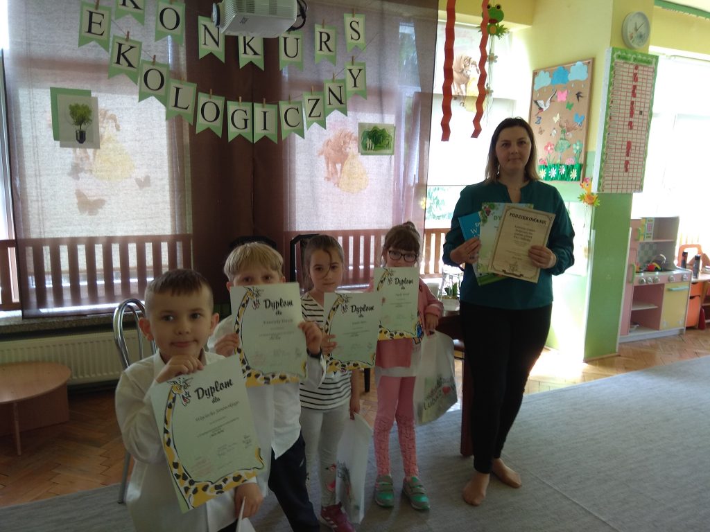 Miejskie Przedszkole Nr 1 „Kraina Uśmiechu” było organizatorem Konkursu Ekologicznego, w którym wzięły udział dzieci ze wszystkich miejskich przedszkoli w Lubaczowie. Podczas konkursu dzieci musiały wykazać się wiedzą m.in. z zakresu: zagrożeń związanych z nieodpowiednim postępowaniem wobec przyrody; prawidłowych zachowań podczas niebezpiecznych sytuacji, np. pożar czy prawidłowej segregacji odpadów. Nasze przedszkole zdobyło III miejsce, a reprezentantami byli: Drozd Franciszek, Janowski Wojciech, Kowal Jagoda, Pióro Emilia. Życzymy wszystkim wielu sukcesów!