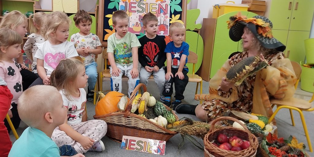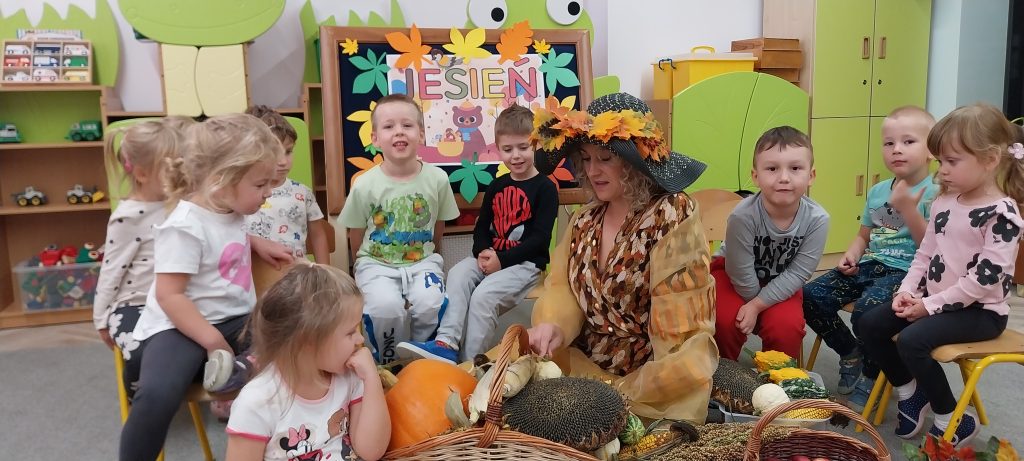 Powitanie Pani Jesieni w grupie Żabki. Pani Jesień przybyła do naszego przedszkola pięknie ubrana z koszem pełnym skarbów: kasztany, żołędzie, jabłka oraz inne dary natury. Dzieci oglądały dotykały i rozpoznawały jesienne skarby. Razem z Panią Jesienią przedszkolaki śpiewały piosenki, tańczyły i bawiły się wesoło. Na koniec zajęć wykonały prace plastyczną Pani Jesień.