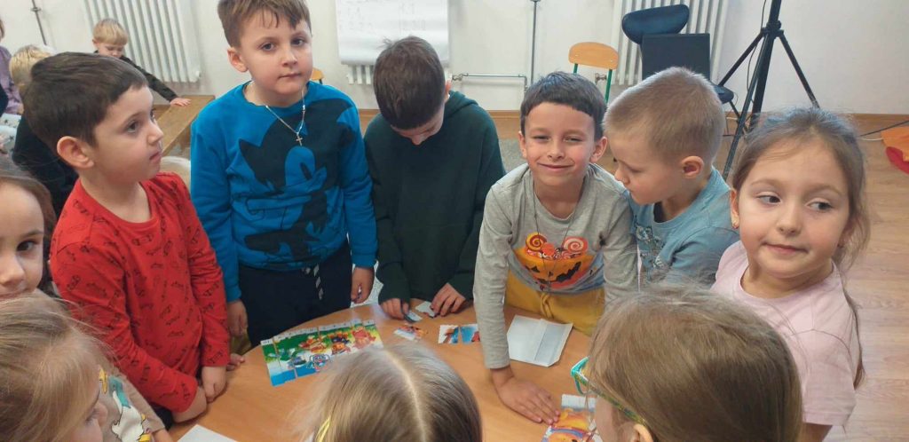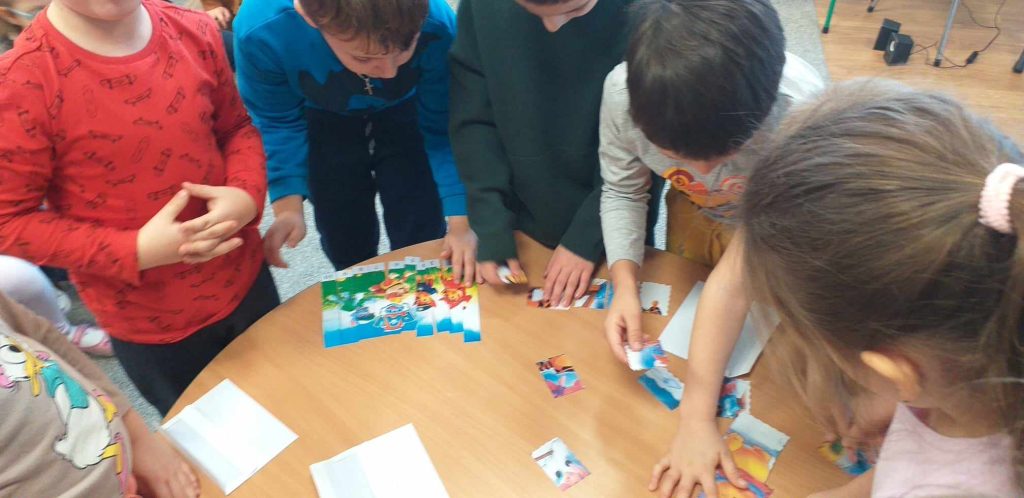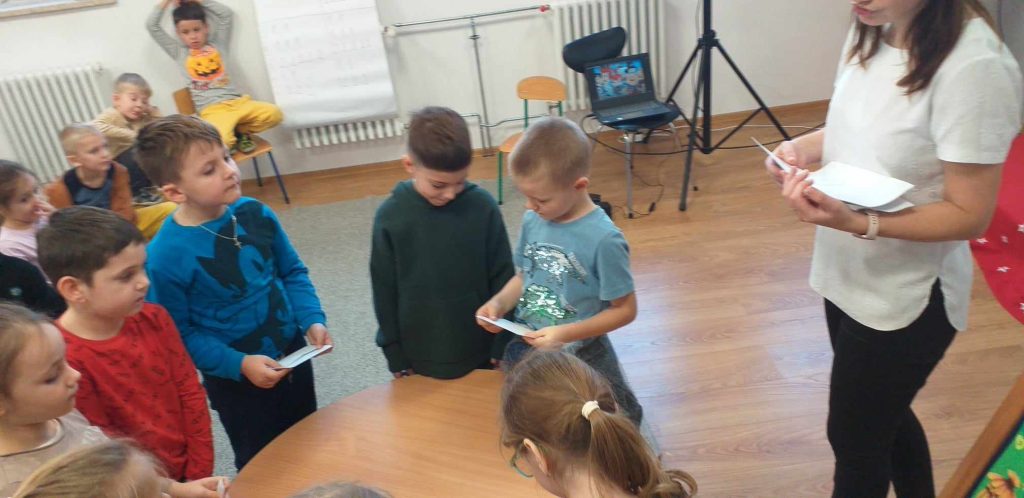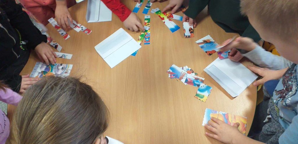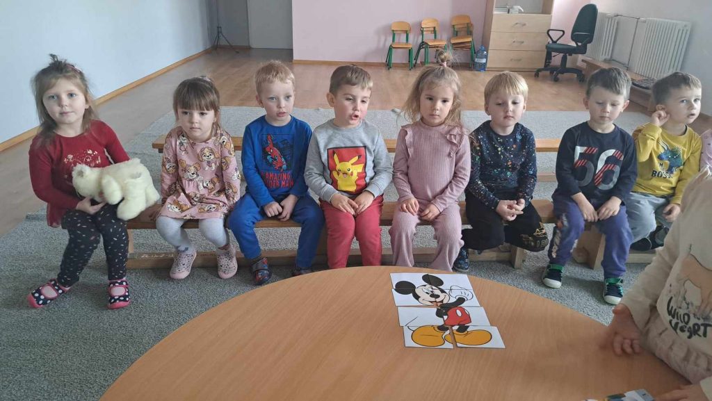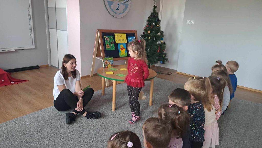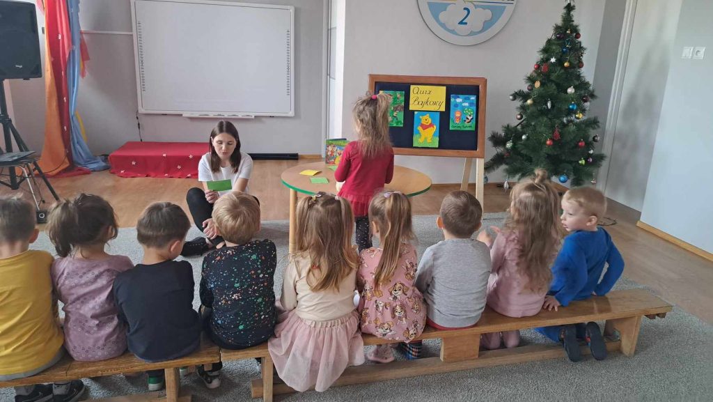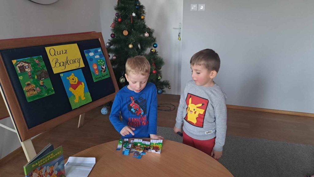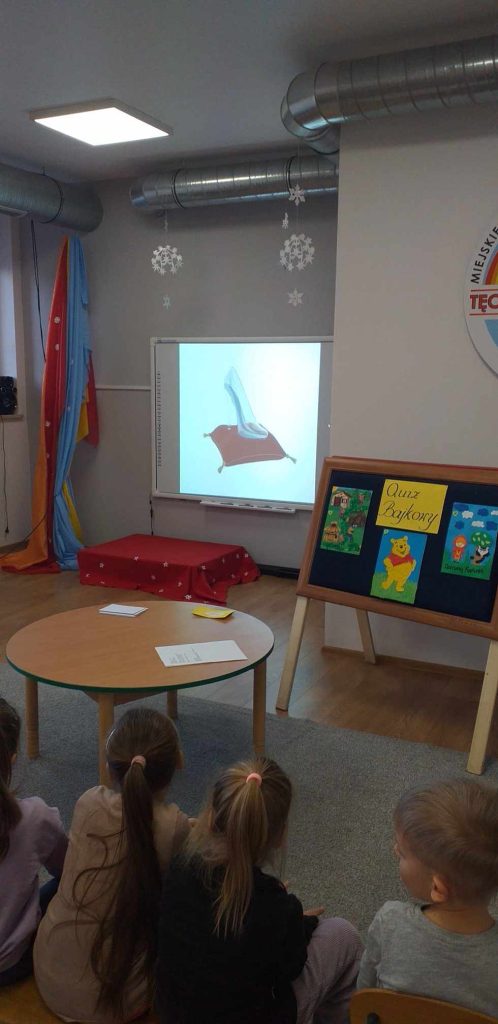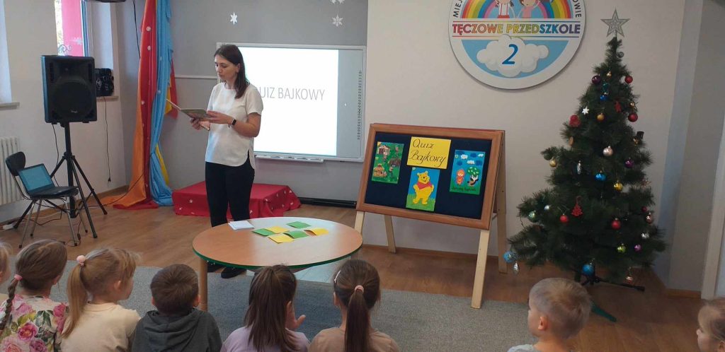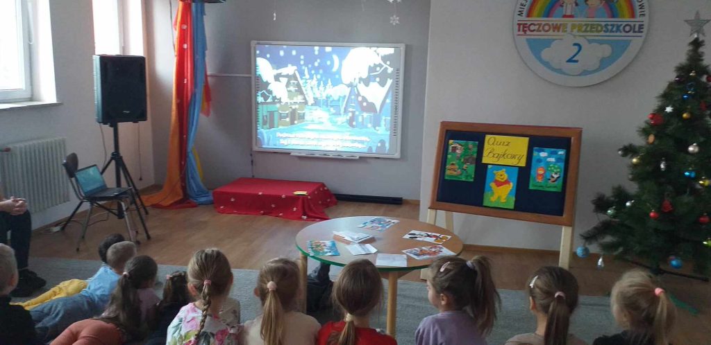 19 grudnia 2023r. odbył się quiz wiedzy bajkowej, w którym wzięły udział grupy ,,Żabki”, ,,Smerfy” i ,,Leśne Duszki”.  Celem quizu było  rozbudzenie zainteresowań czytelniczych  oraz sprawdzenie wiedzy dzieci  na temat znajomości tytułów bajek i bohaterów bajkowych. Dzieci rozwiązywały zagadki słowne oraz muzyczne, miały za zadanie podać tytuł bajki rozpoznanej po czytanym fragmencie oraz układały bajkowe puzzle. Każda grupa wykazała się doskonałą znajomością bajek. Na zakończenie przedszkolaki obejrzały wspólnie bajkę.