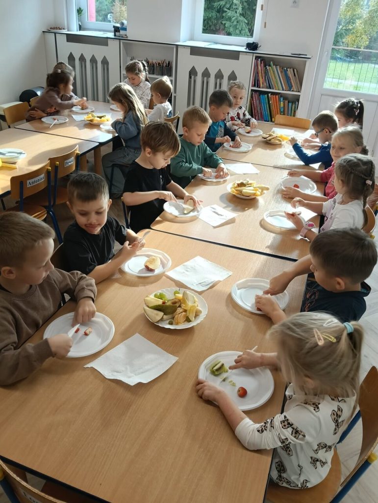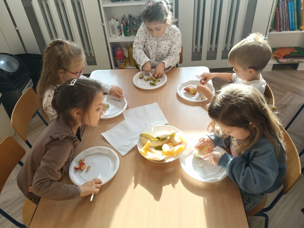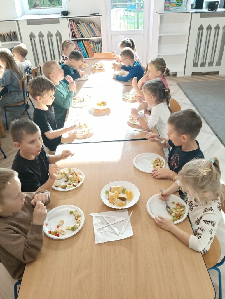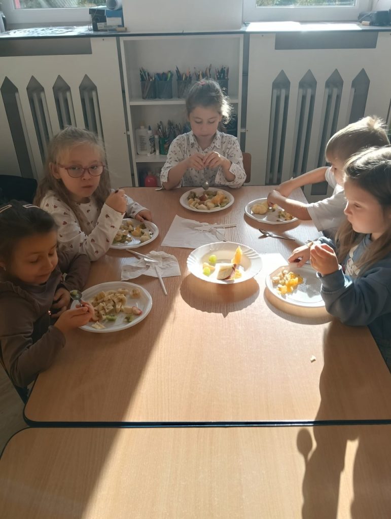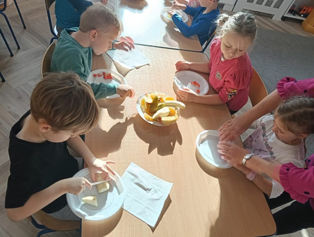 Dzisiaj dzieci wspólnie przygotowywały sałatkę owocową. Podczas zajęć miały okazję poznać różne owoce, nauczyć się je kroić i mieszać. Wspólna praca pozwoliła im ćwiczyć współpracę, samodzielność oraz rozwijać umiejętności kulinarne. Było dużo śmiechu i zabawy, a efekt końcowy wszystkim bardzo smakował! 🍓🍎