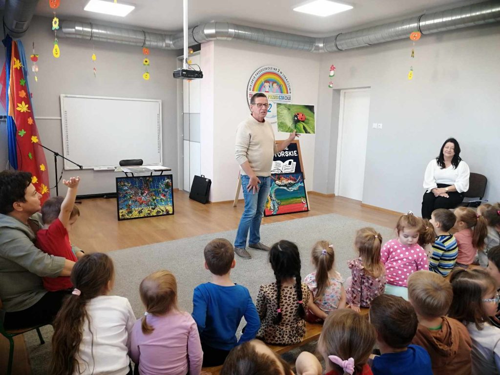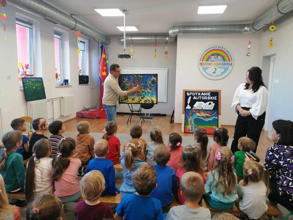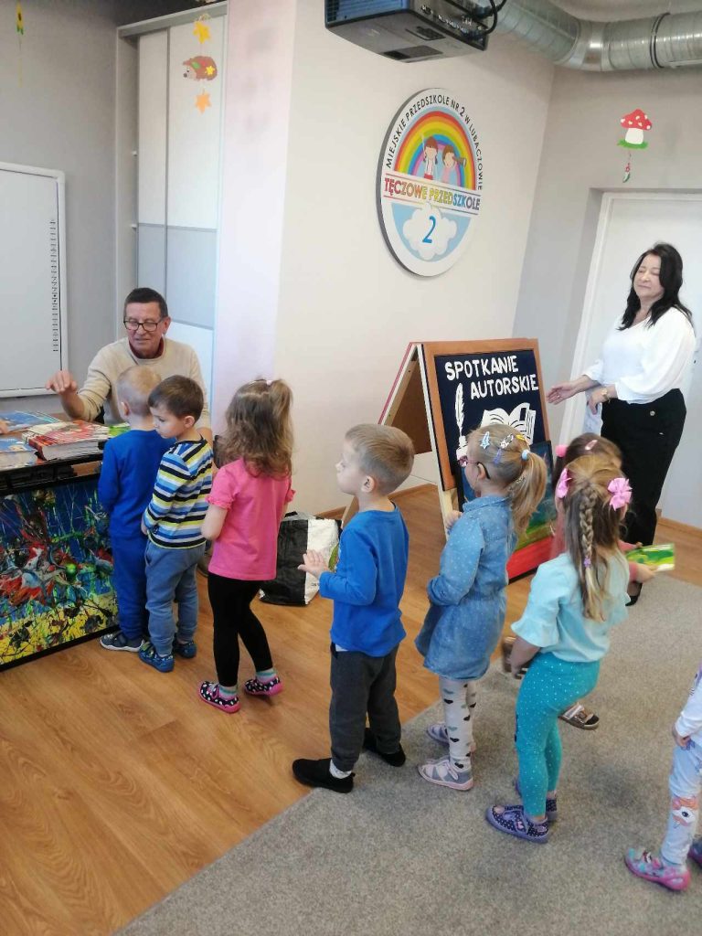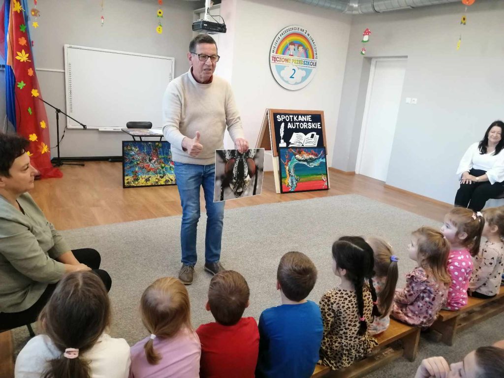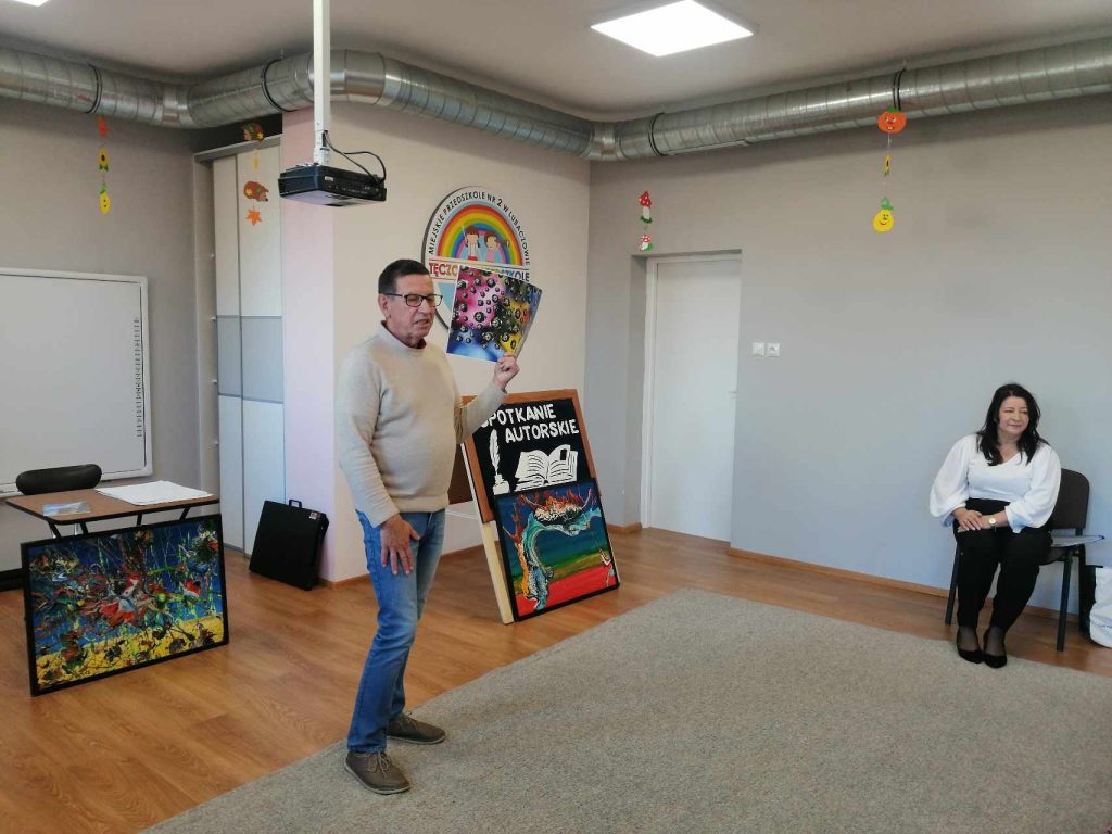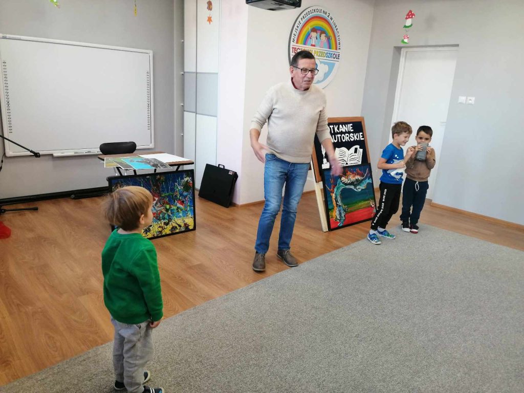 16 listopada przedszkole odwiedził Pan Wojciech Ulman, który opowiedział dzieciom o swoich pasjach: pisaniu bajek i wierszy dla dzieci, fotografii i malarstwie. Pan Wojciech zaprezentował dzieciom fragmenty swoich bajek oraz piękne obrazy, które są wytworem wyobraźni artysty. Przedszkolaki z zainteresowaniem słuchały autora i odpowiadały na przygotowane zagadki i pytania. Pisarz uświadomił wszystkim, że warto czytać, aby rozwijać swoje zdolności i wyobraźnię. Na koniec każde dziecko otrzymało książkę z autografem.