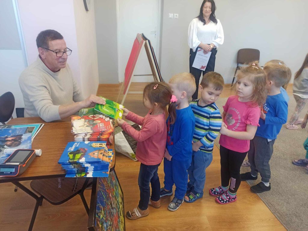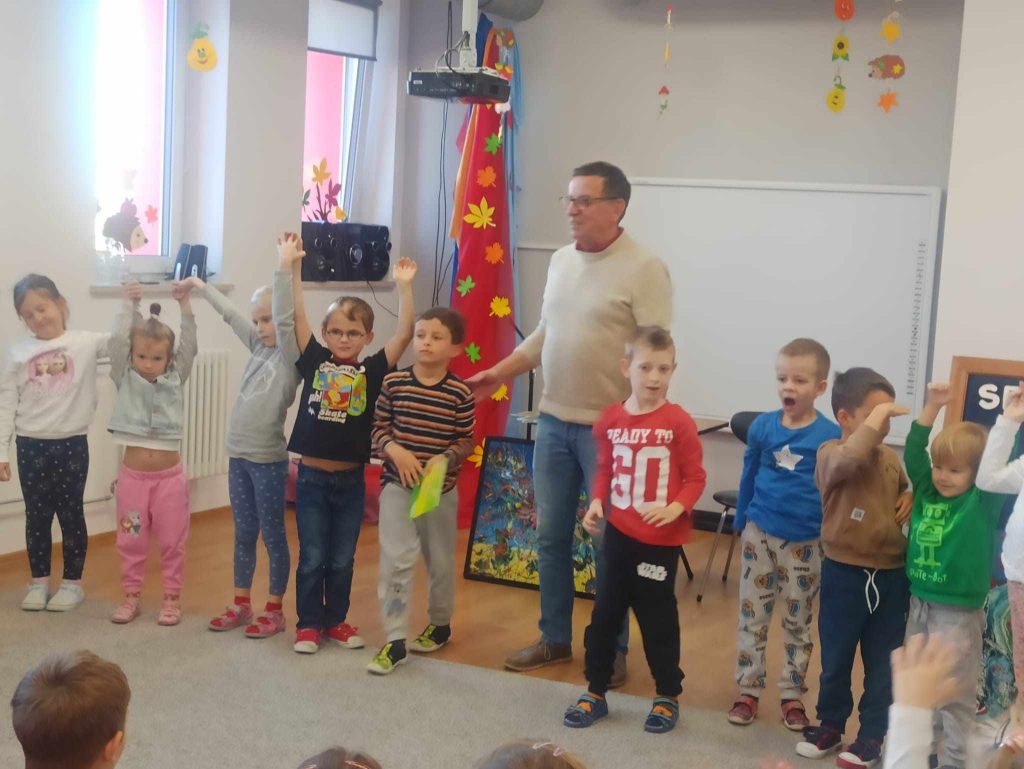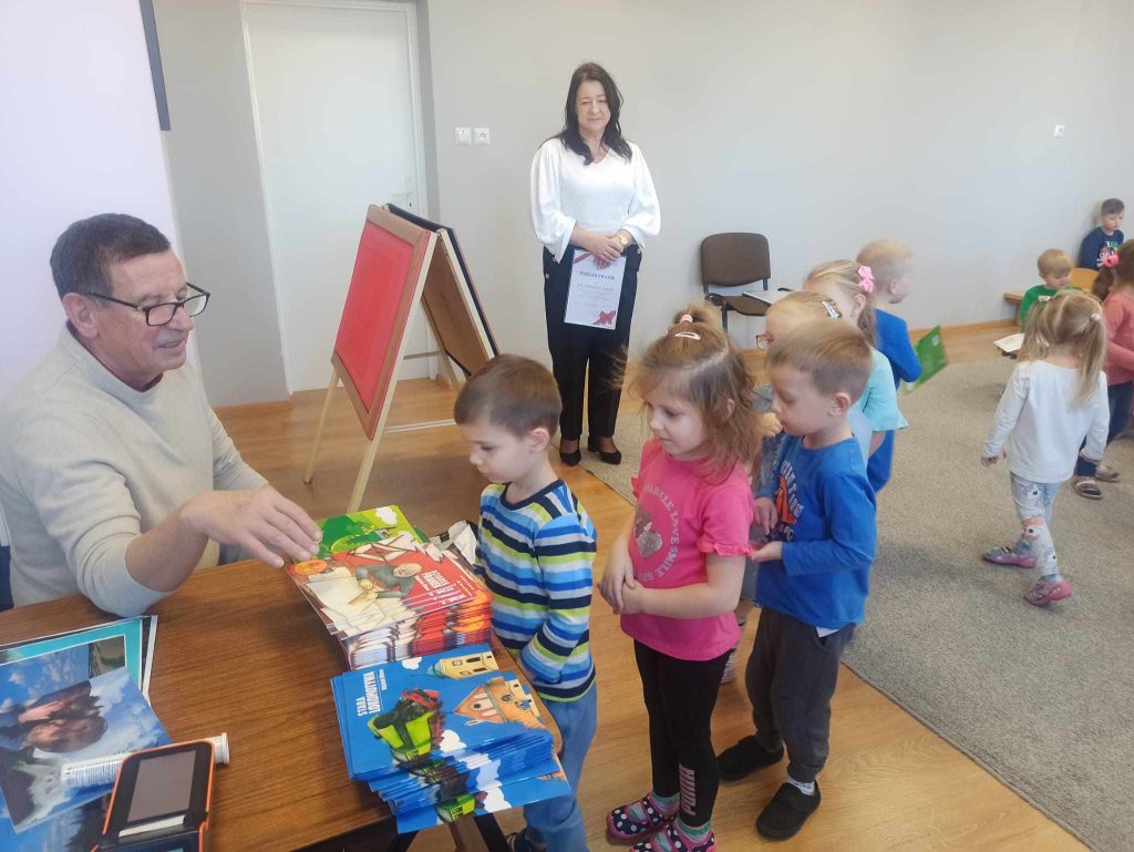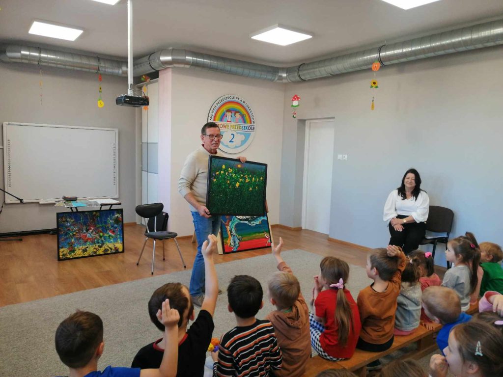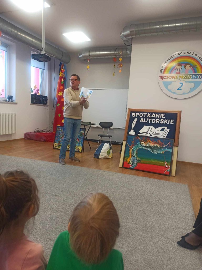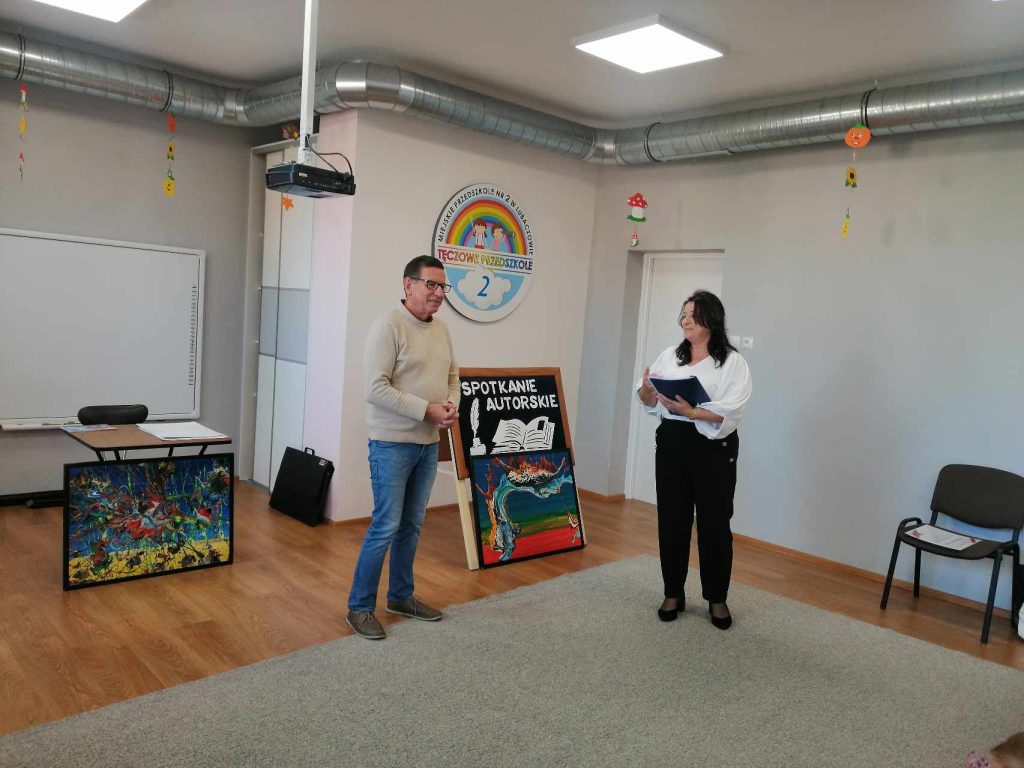16 listopada przedszkole odwiedził Pan Wojciech Ulman, który opowiedział dzieciom o swoich pasjach: pisaniu bajek i wierszy dla dzieci, fotografii i malarstwie. Pan Wojciech zaprezentował dzieciom fragmenty swoich bajek oraz piękne obrazy, które są wytworem wyobraźni artysty. Przedszkolaki z zainteresowaniem słuchały autora i odpowiadały na przygotowane zagadki i pytania. Pisarz uświadomił wszystkim, że warto czytać, aby rozwijać swoje zdolności i wyobraźnię. Na koniec każde dziecko otrzymało książkę z autografem.