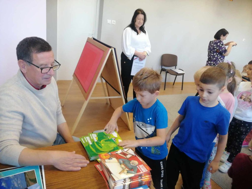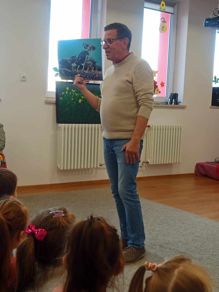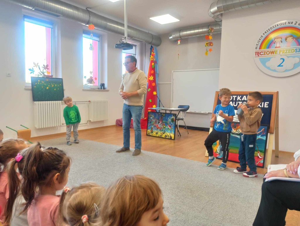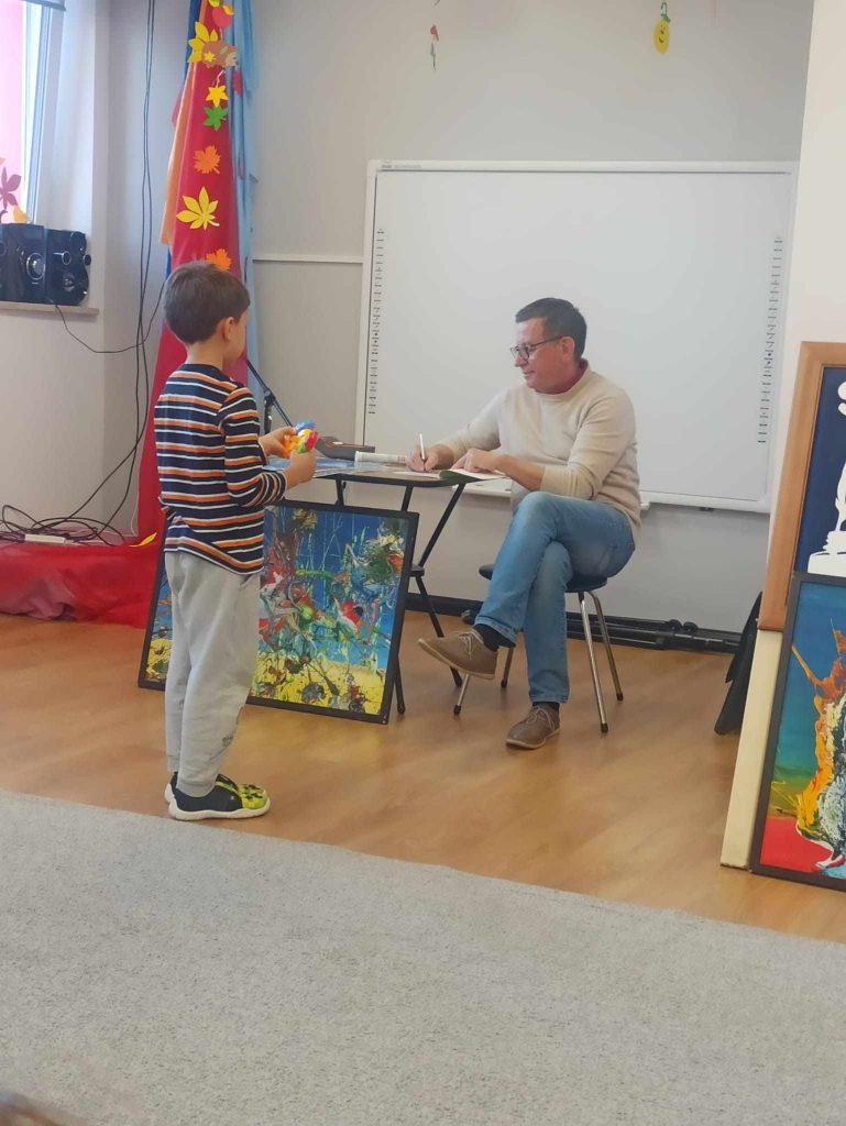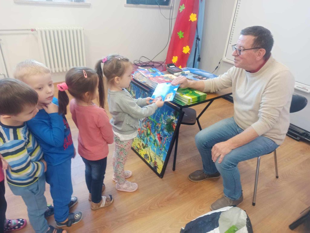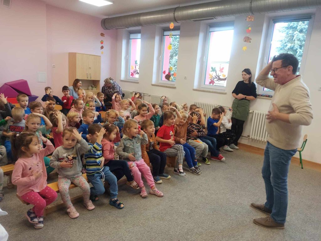 16 listopada przedszkole odwiedził Pan Wojciech Ulman, który opowiedział dzieciom o swoich pasjach: pisaniu bajek i wierszy dla dzieci, fotografii i malarstwie. Pan Wojciech zaprezentował dzieciom fragmenty swoich bajek oraz piękne obrazy, które są wytworem wyobraźni artysty. Przedszkolaki z zainteresowaniem słuchały autora i odpowiadały na przygotowane zagadki i pytania. Pisarz uświadomił wszystkim, że warto czytać, aby rozwijać swoje zdolności i wyobraźnię. Na koniec każde dziecko otrzymało książkę z autografem.