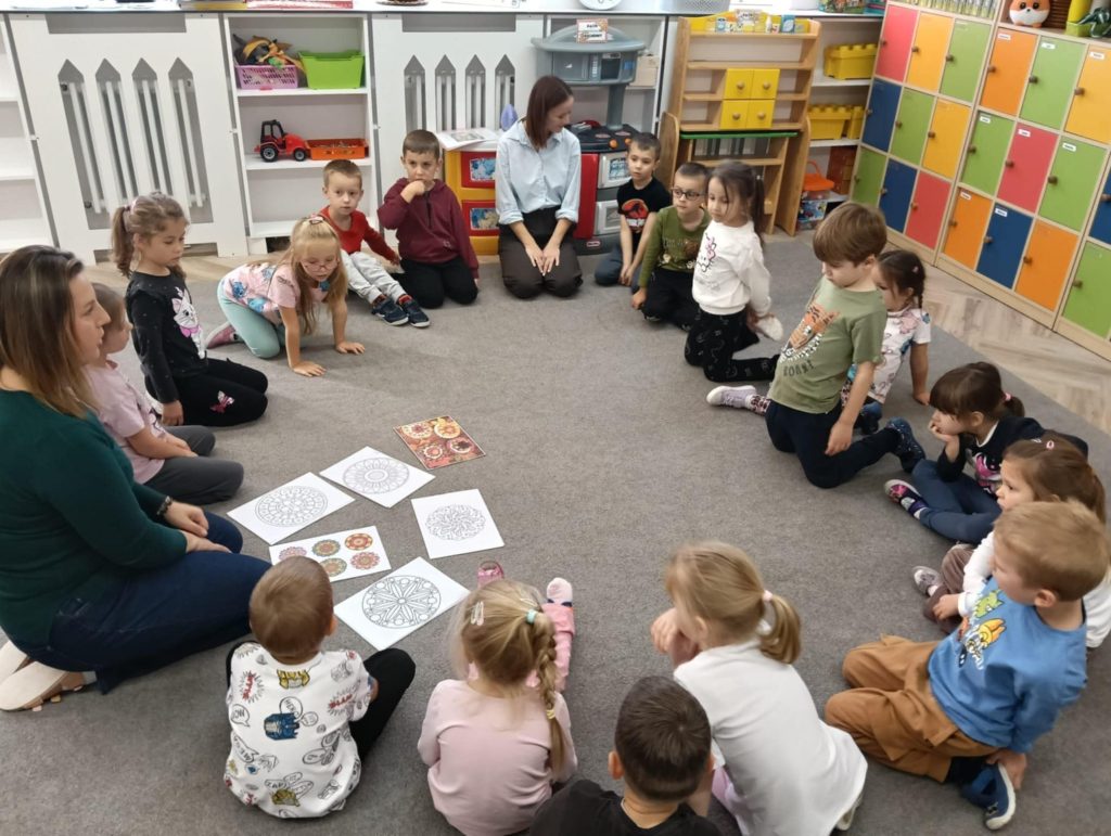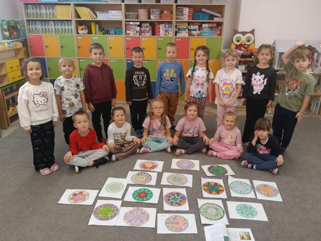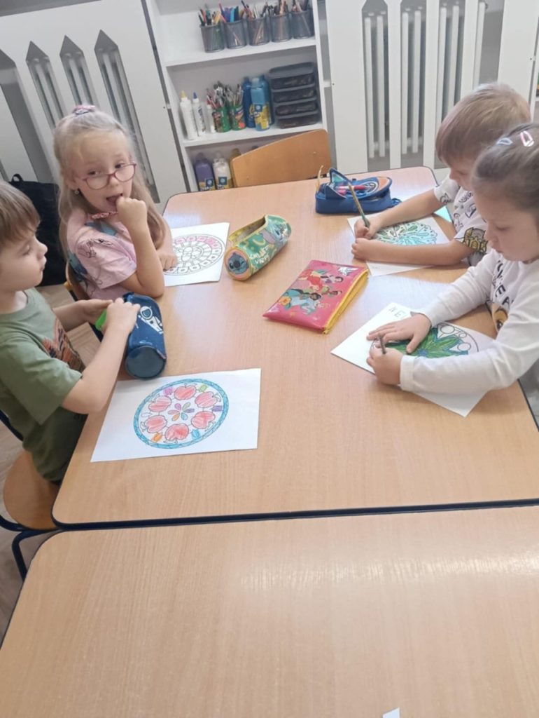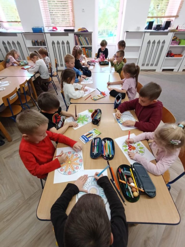 Po rozmowie o emocjach i sposobach radzenia sobie z nimi, dzieci wykonały piękne mandale, słuchając muzyki relaksacyjnej (Kołysanka Johannesa Brahmsa) w ciszy i skupieniu.