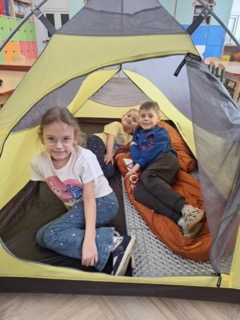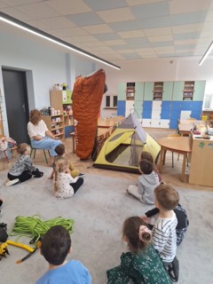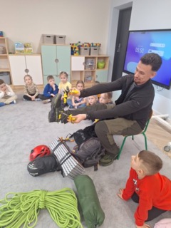 Podczas spotkania przedszkolaki mogły zobaczyć prawdziwy sprzęt podróżnika – duży plecak, liny, śpiwór, namiot, a także raki i czekany używane podczas górskich wypraw. Największą atrakcją było to, że dzieci mogły zajrzeć do plecaka oraz wejść do namiotu i poczuć się jak na prawdziwej wyprawie 🏕️.
