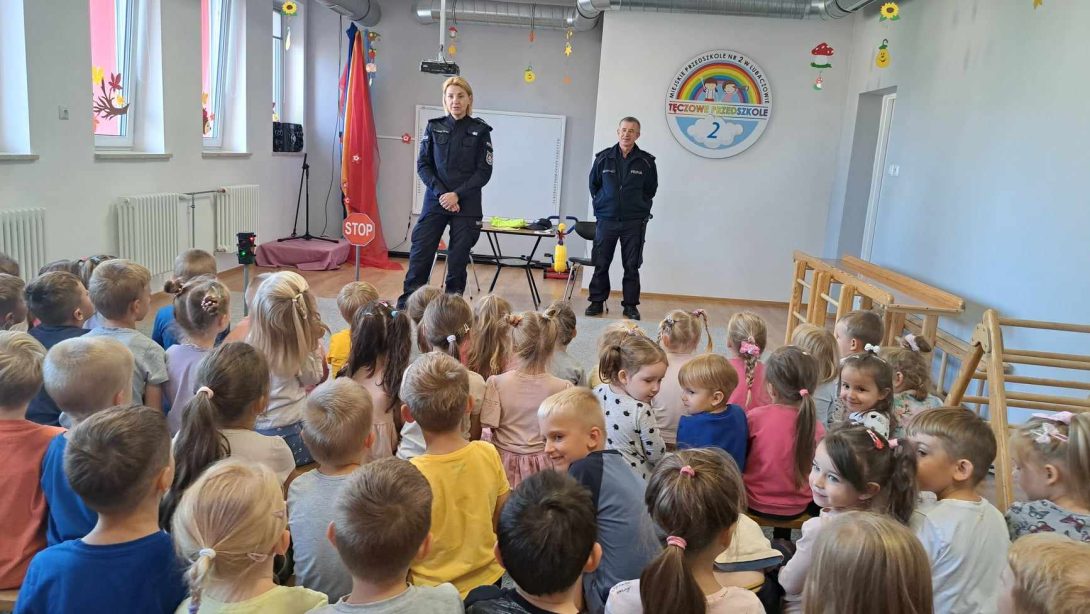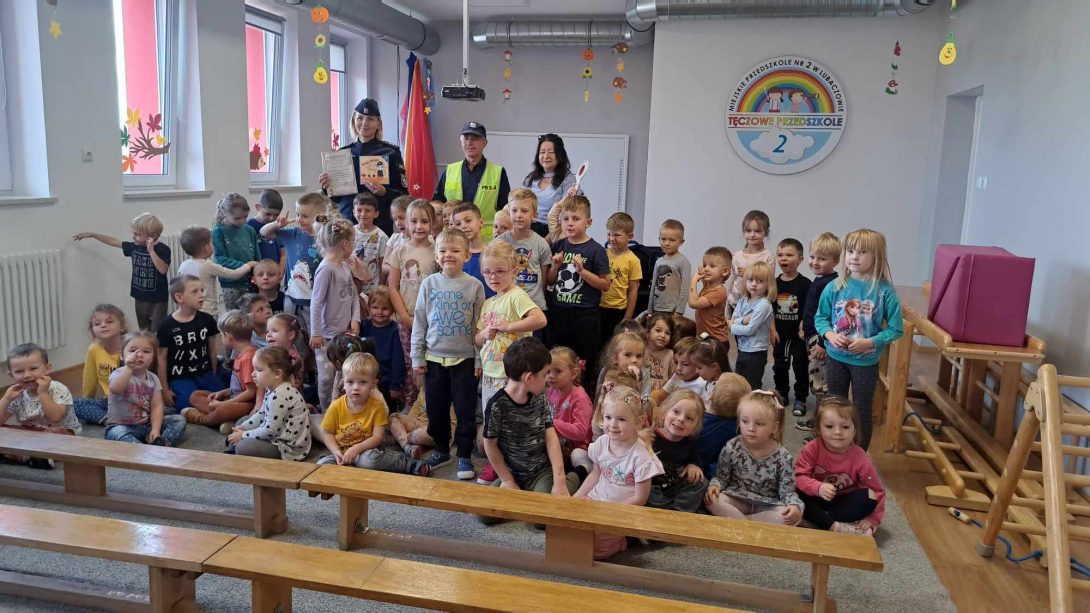 Dnia 06.10.2023r. przedszkole odwiedzili policjanci z Komendy Powiatowej Policji w Lubaczowie. Celem wizyty było przypomnienie dzieciom o bezpieczeństwie w przedszkolu i poza nim. Pani policjantka wyjaśniła dzieciom zasady bezpiecznego poruszania się po drodze. Policjanci zaprezentowali wyposażenie policyjne niezbędne podczas wykonywanej pracy.