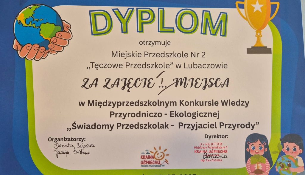 20 maja w Miejskim Przedszkolu Nr 1 w Lubaczowie odbył się Międzyprzedszkolny Konkurs Wiedzy Przyrodniczo – Ekologicznej „Świadomy Przedszkolak – Przyjaciel Przyrody”. Czterech reprezentantów z naszej placówki z grupy Smerfy oraz Leśne Duszki – Dominik, Alicja, Kuba oraz Antek wykazali się wiadomościami oraz umiejętnościami, które pozwoliły im osiągnąć najlepszy wynik. Rozgrywka była emocjonująca do ostatniej minuty. Ostatecznie po rundzie dodatkowej to starszaki z „Tęczowego Przedszkola” osiągnęły podium.