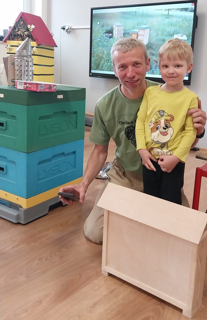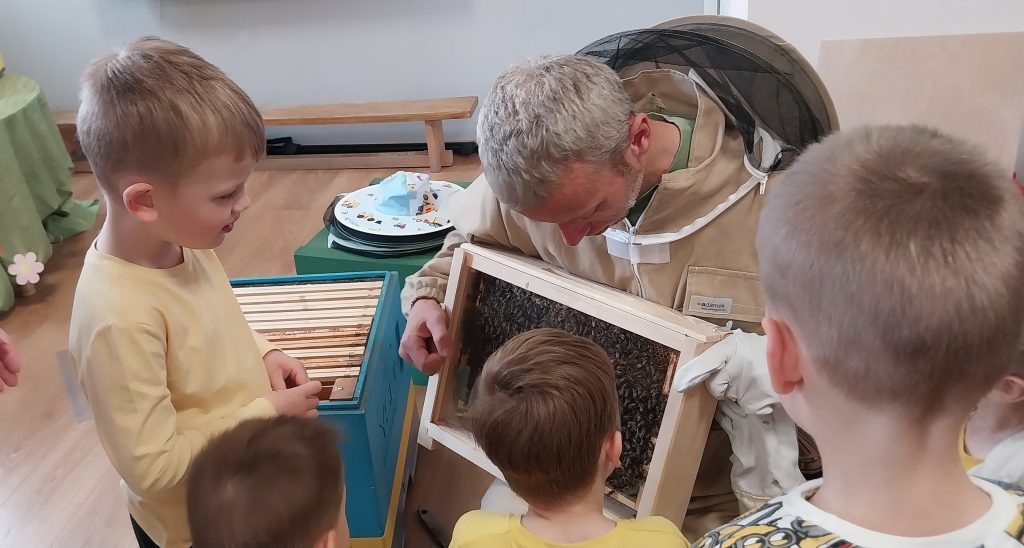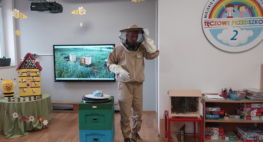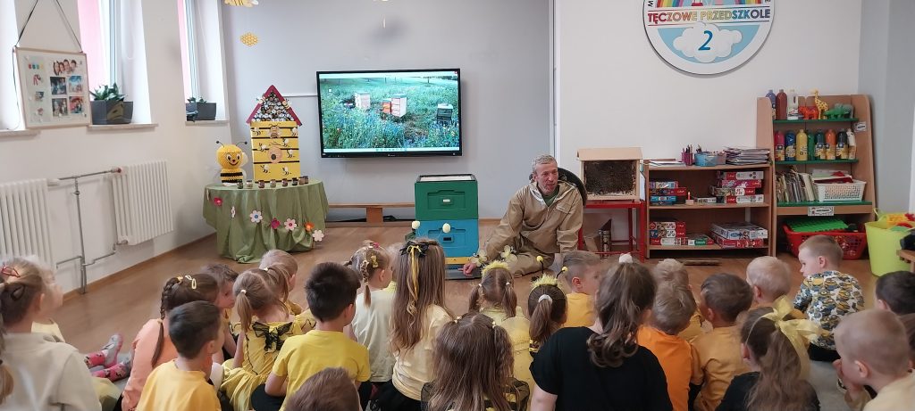 Dnia 20 maja nasze przedszkole odwiedził wyjątkowy gość pan pszczelarz, który z ogromną radością przybliżył dzieciom świat pszczół. Pan Piotr opowiedział dzieciom o swojej pasji, pokazał strój ochronny, narzędzia pszczelarskie. Przedszkolaki dowiedziały się jak powstaje miód, czym zajmuje się królowa pszczół, jak wygląda życie w ulu. Dzieci miały okazję spróbować różnych rodzajów miodu co sprawiło im wiele radości. Wizyta pszczelarza była dla przedszkolaków nie tylko ciekawą przygodą, ale też cenną lekcją przyrodniczą. Dziękujemy panu Piotrowi za poświęcony nam czas.