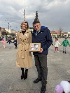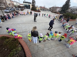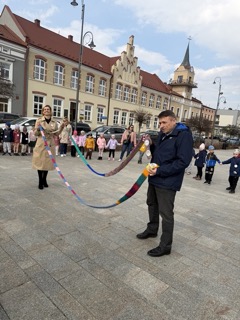 Kulminacyjnym momentem przedsięwzięcia był uroczysty pochód, który odbył się 12 marca. Cała społeczność przedszkola przemaszerowała ulicami miasta na Rynek, gdzie gotowy szalik został przekazany Burmistrzowi Lubaczowa, Krzysztofowi Szpytowi, z prośbą o symboliczne udekorowanie nim Lubacza.