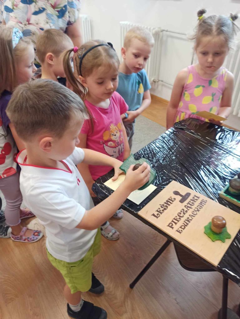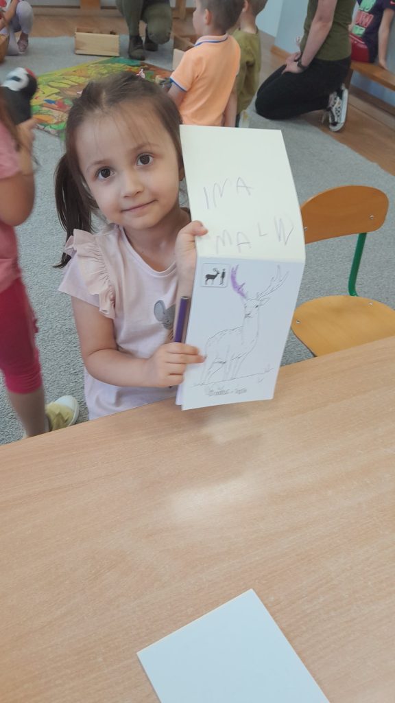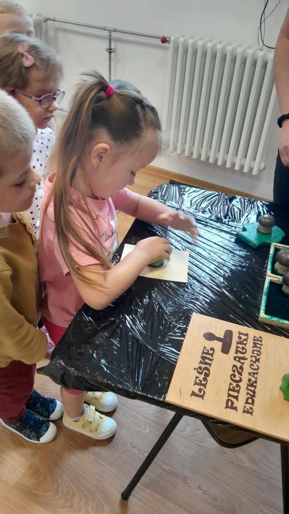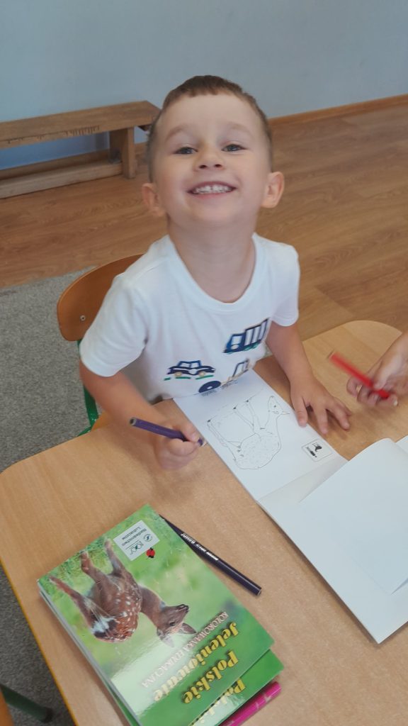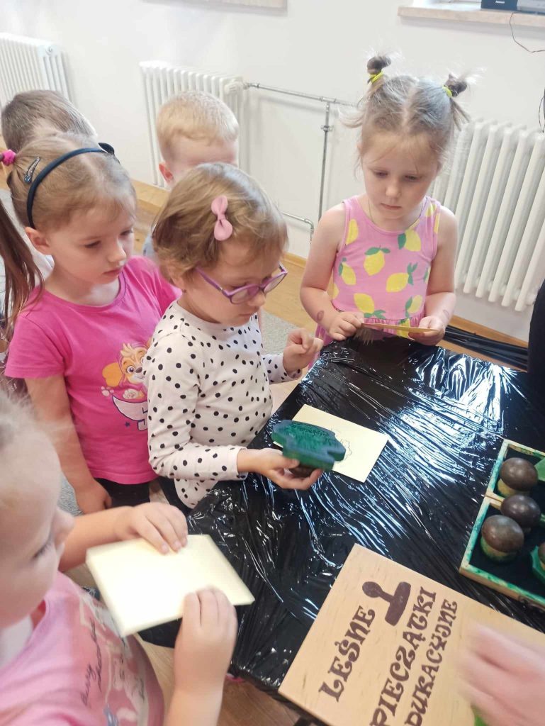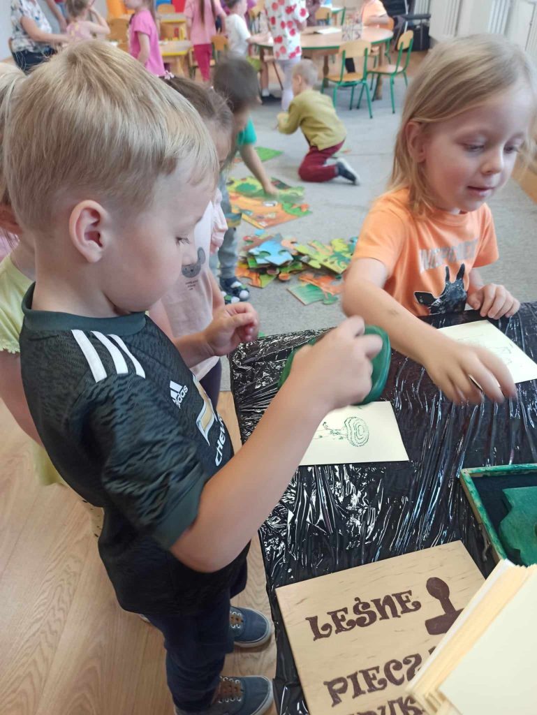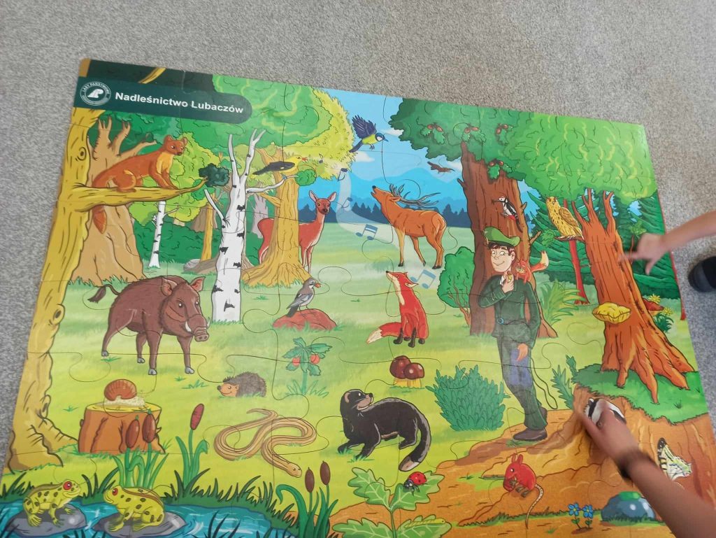 Dzieci dowiedziały się, jakie zwierzęta żyją w lasach. Układały wielkie puzzle o tematyce leśnej oraz odbijały leśne pieczątki. Każde dziecko otrzymało piękną kolorowankę ze zwierzątkami.