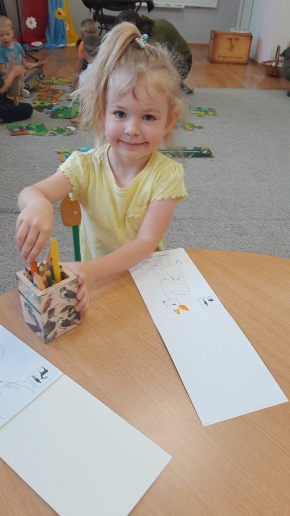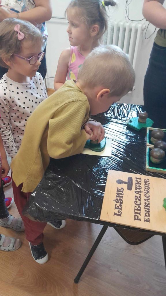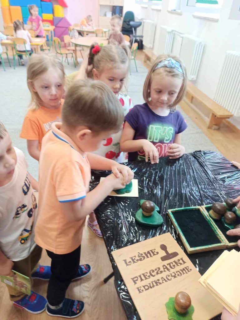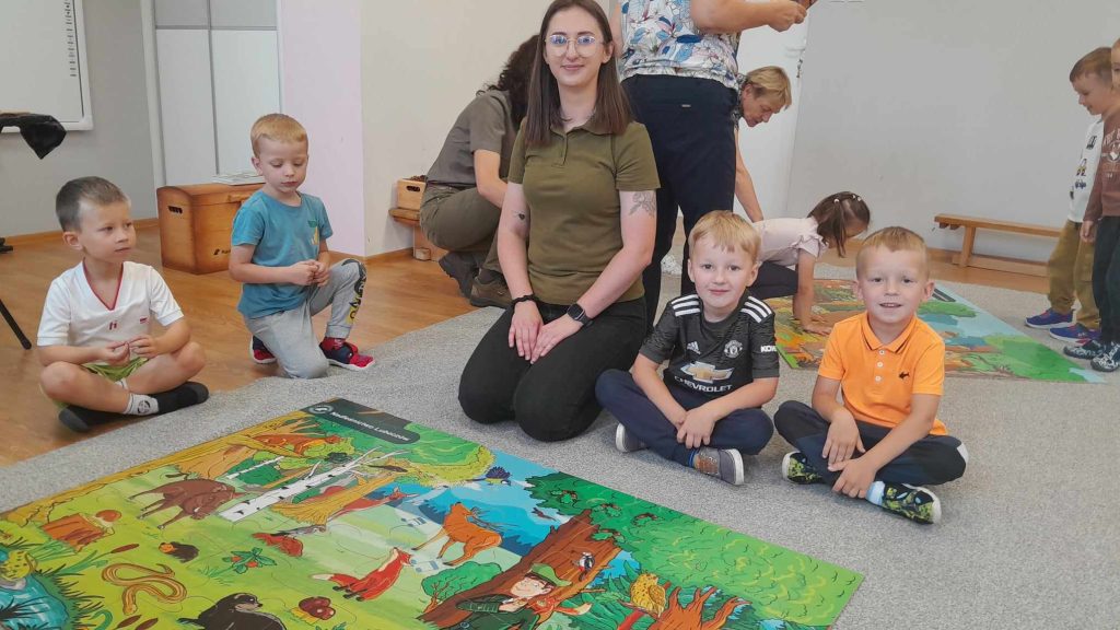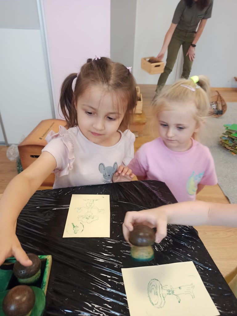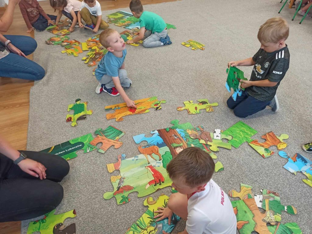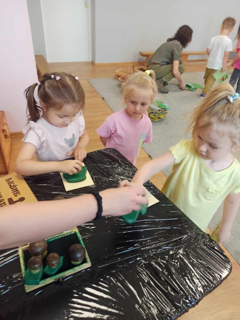 Dzieci dowiedziały się, jakie zwierzęta żyją w lasach. Układały wielkie puzzle o tematyce leśnej oraz odbijały leśne pieczątki. Każde dziecko otrzymało piękną kolorowankę ze zwierzątkami.