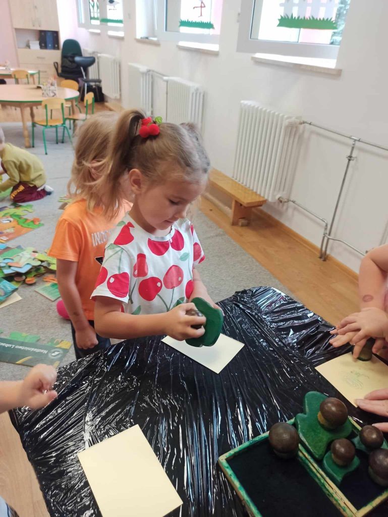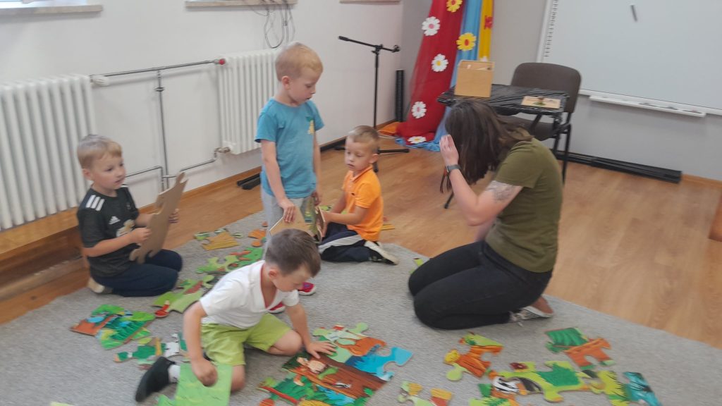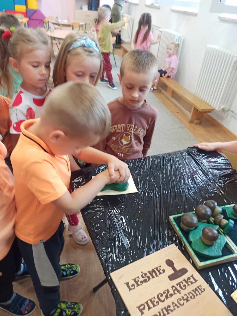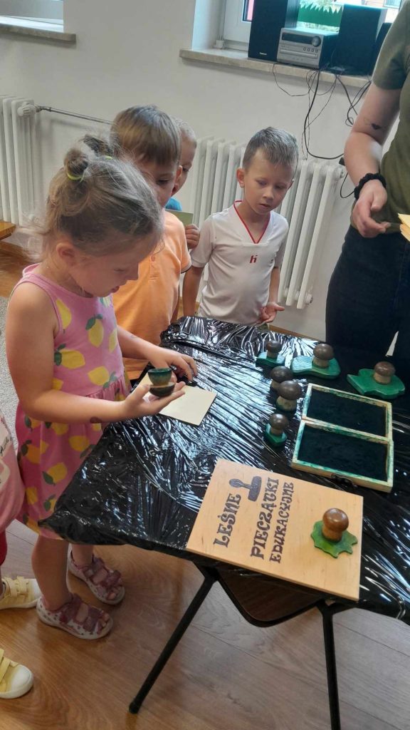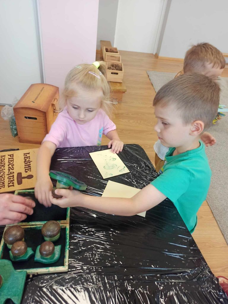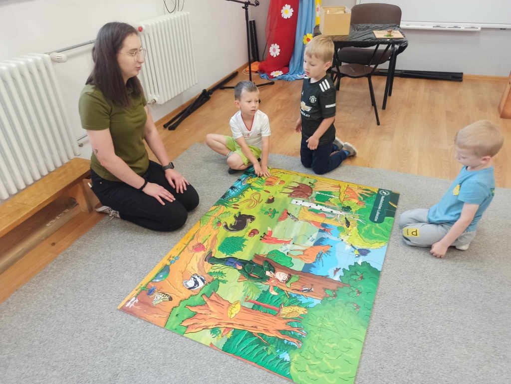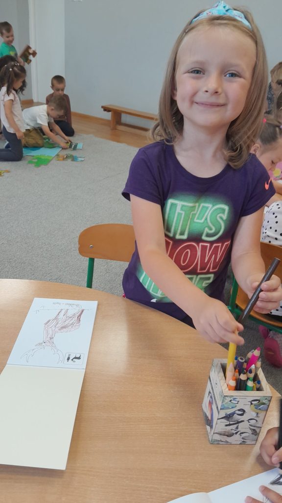 Dzieci dowiedziały się, jakie zwierzęta żyją w lasach. Układały wielkie puzzle o tematyce leśnej oraz odbijały leśne pieczątki. Każde dziecko otrzymało piękną kolorowankę ze zwierzątkami.