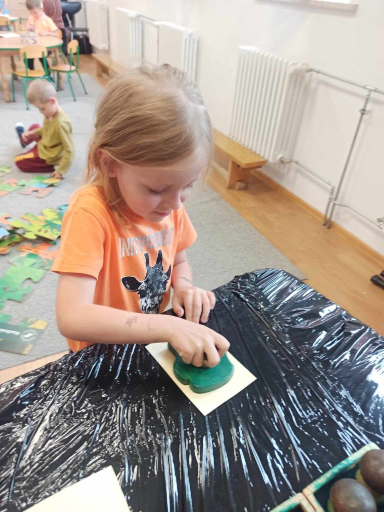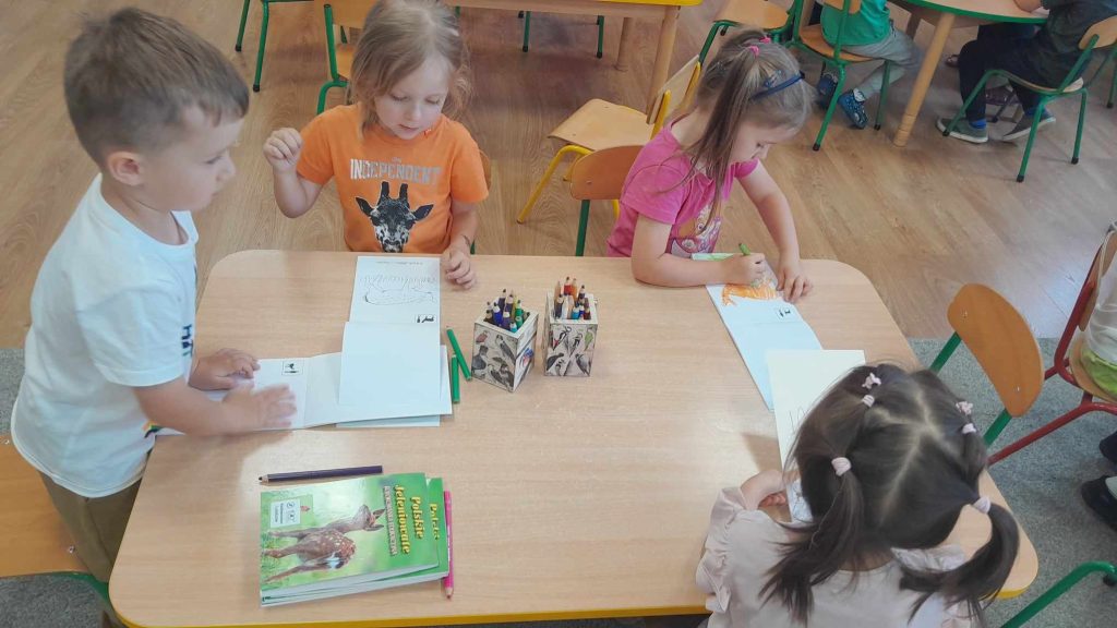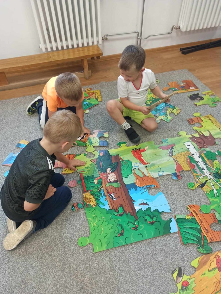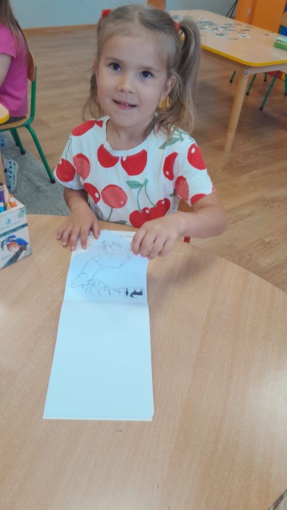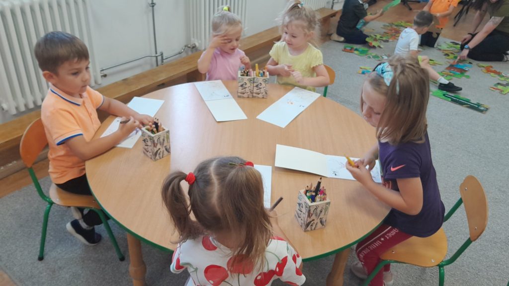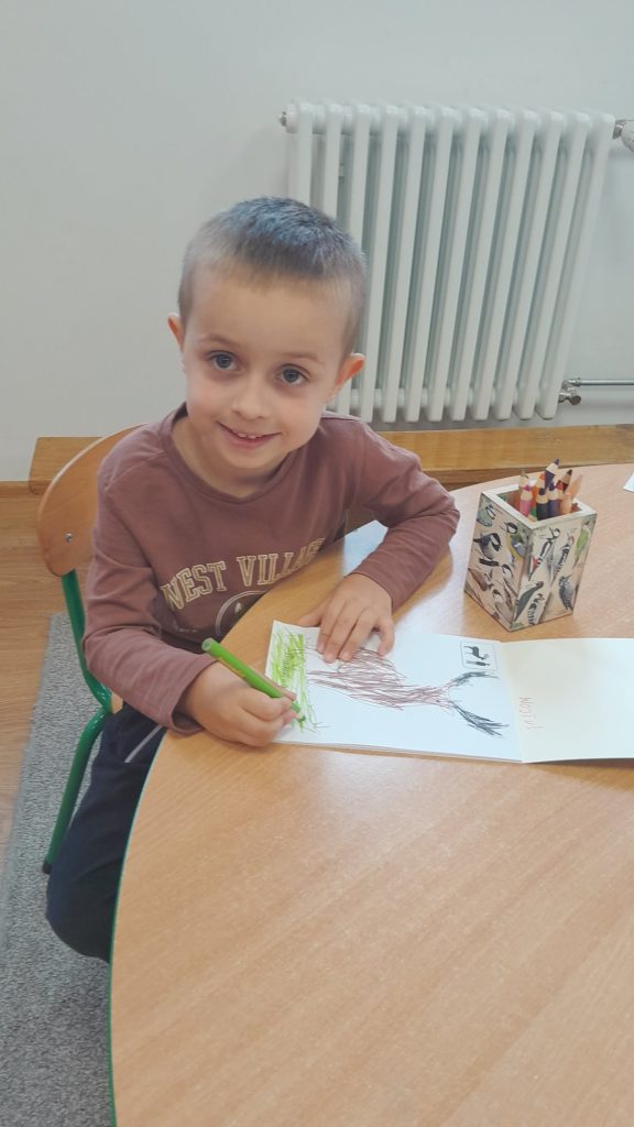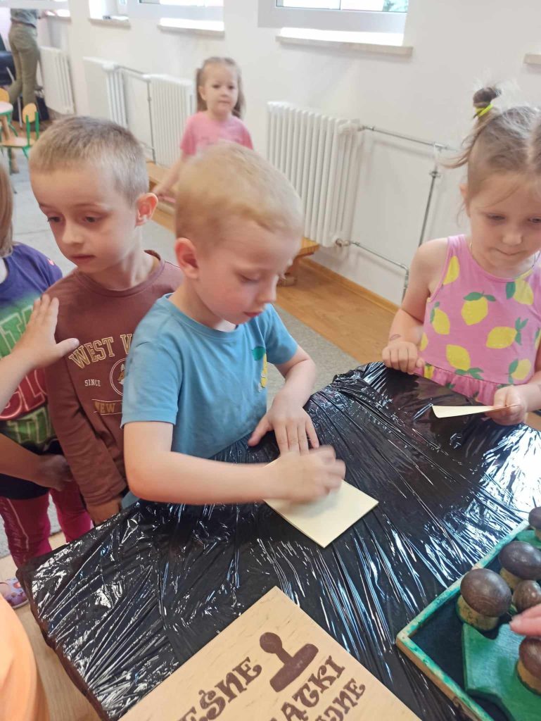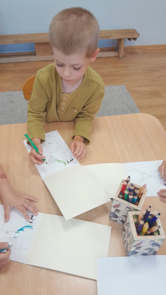 Dzieci dowiedziały się, jakie zwierzęta żyją w lasach. Układały wielkie puzzle o tematyce leśnej oraz odbijały leśne pieczątki. Każde dziecko otrzymało piękną kolorowankę ze zwierzątkami.