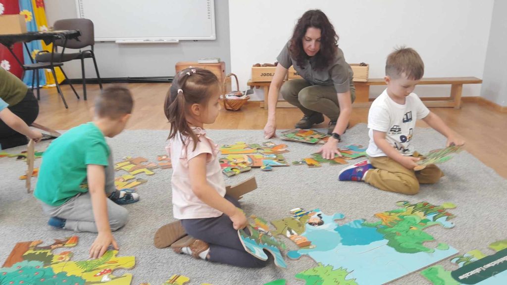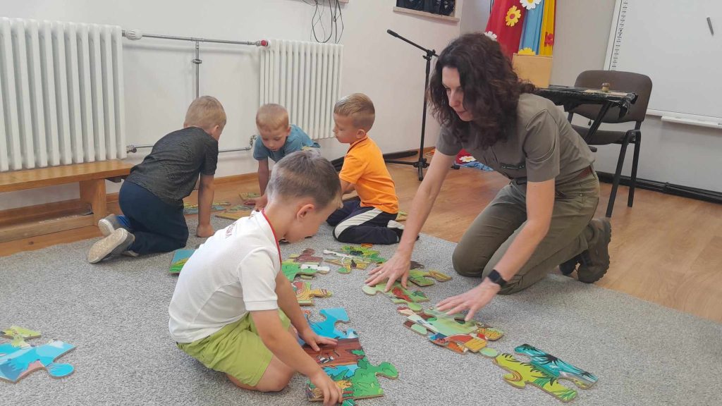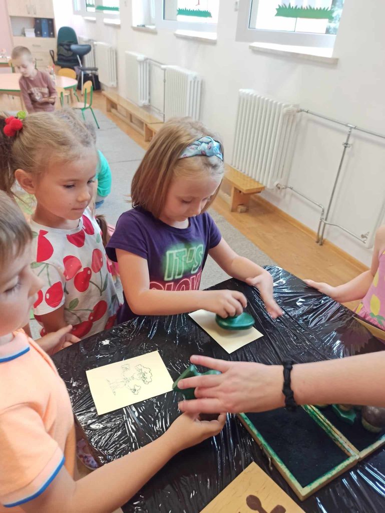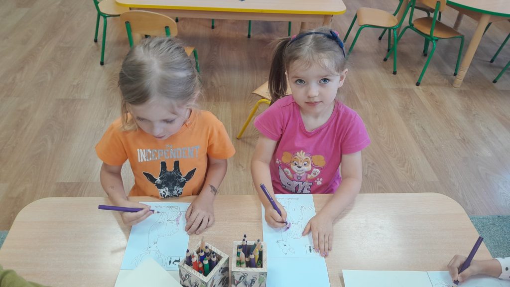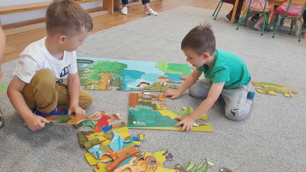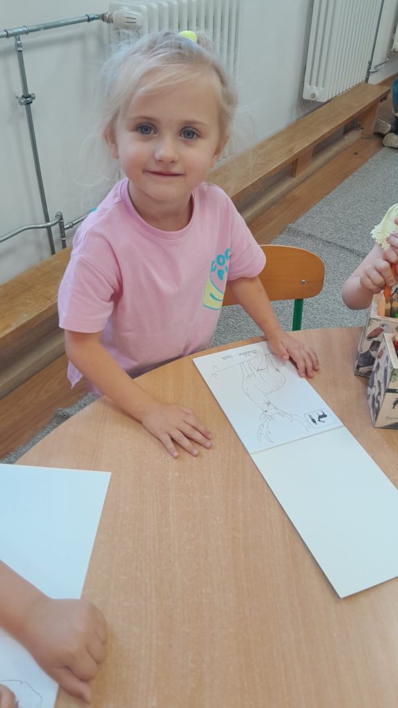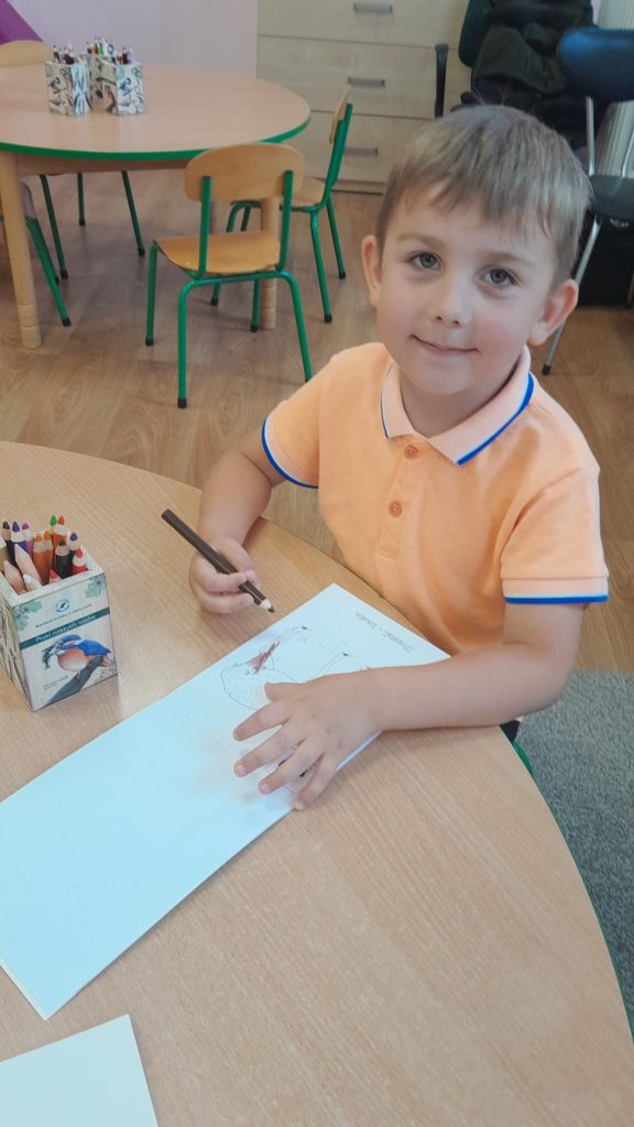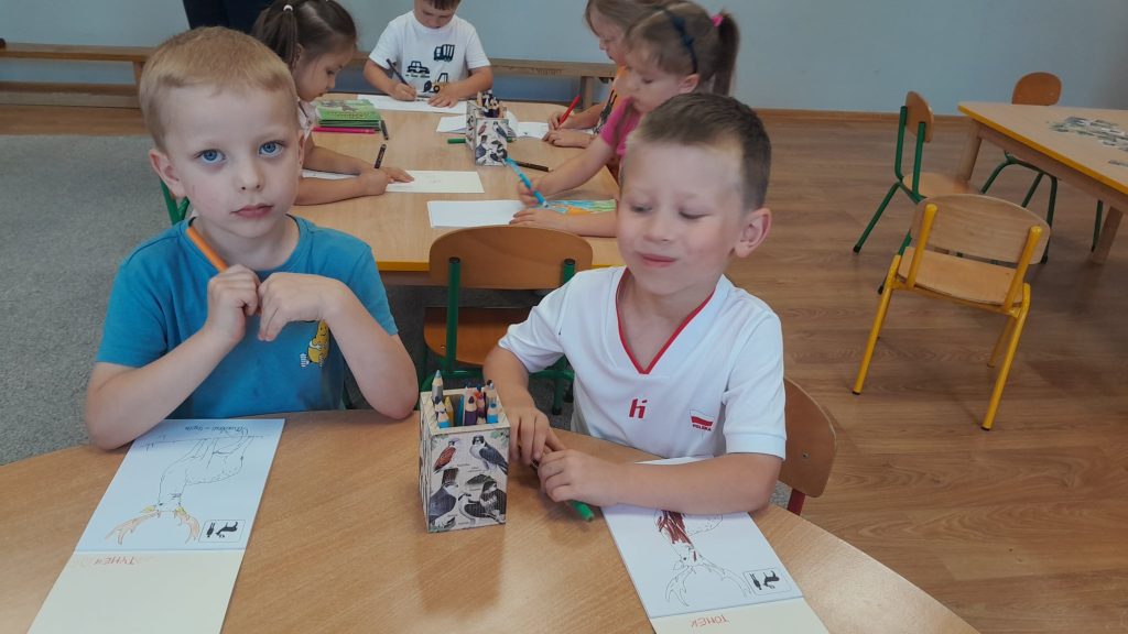 Dzieci dowiedziały się, jakie zwierzęta żyją w lasach. Układały wielkie puzzle o tematyce leśnej oraz odbijały leśne pieczątki. Każde dziecko otrzymało piękną kolorowankę ze zwierzątkami.
