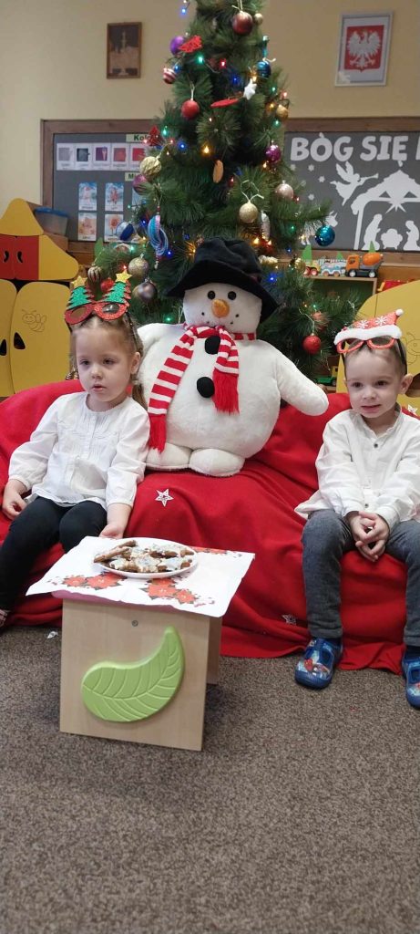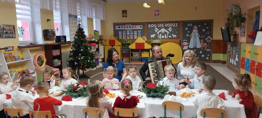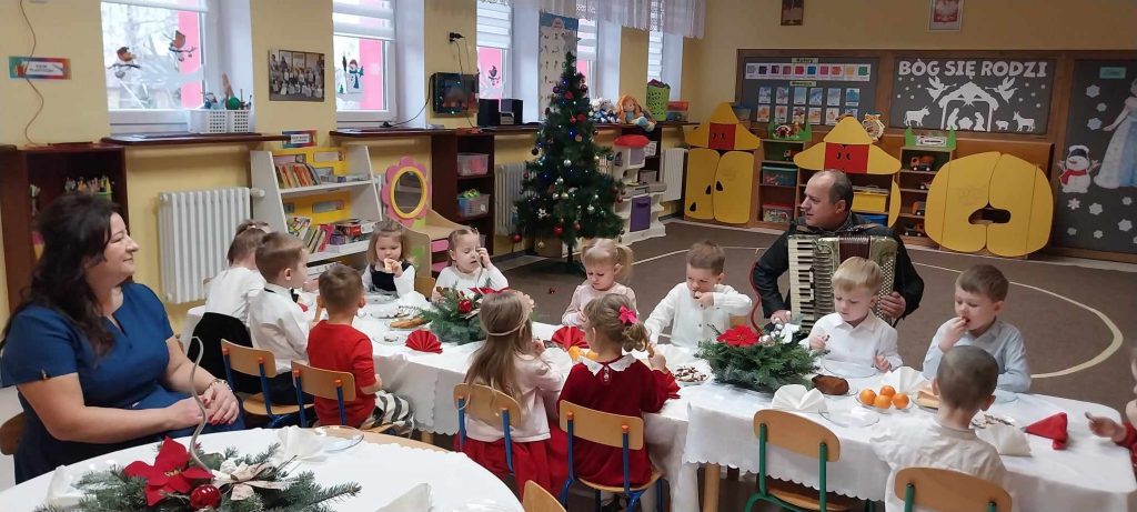 Święta Bożego Narodzenia to jedne z najpiękniejszych dni w roku. Dzieci poznały świąteczne tradycje, wykonały ozdoby oraz uczyły się kolęd. W przedszkolnej Wigilii panowała radosna atmosfera. Wszystkie dzieci były w odświętnych strojach. Uroczystość rozpoczęła się wspólnymi życzeniami i kolędowaniem. Serdeczne podziękowania dla Pana Andrzeja Antonika z Państwowej Szkoły Muzycznej w Lubaczowie, który z nami kolędował i przygrywał na akordeonie.